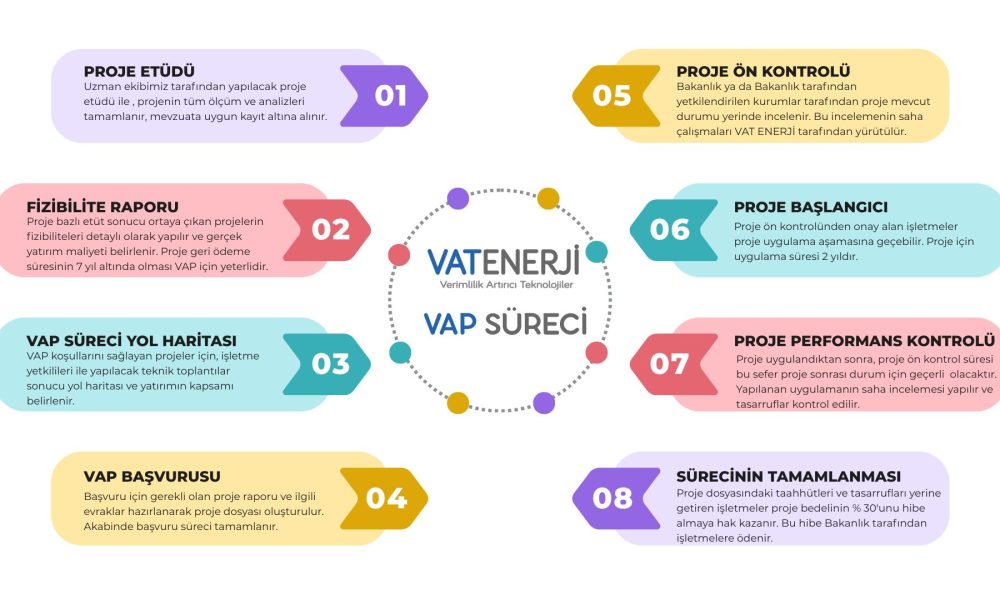 VAP başvurusu için gerekli tüm teknik ve idari dokümanların hazırlanması konusunda işletmeye destek olunması İşletme yetkilileri ile başvuru öncesi değerlendirme toplantısının gerçekleştirilmesi Enerji Verimliliği ve Çevre Daire Başkanlığı’na EVDES üzerinden resmi VAP başvurusunun yapılması (Başvuru bazı dönemlerde KEP adresi üzerinden de alınabilmektedir.)